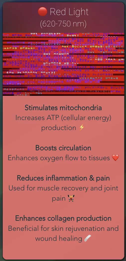Biophotonics explores the ultra-weak light emissions from cells that play a crucial role in cellular communication, energy regulation, and overall health. Different wavelengths of light interact with the body in unique ways, influencing processes such as cell repair, energy production, mood, and inflammation. Light therapy harnesses these effects by using specific frequencies to enhance mitochondrial function and promote healing.